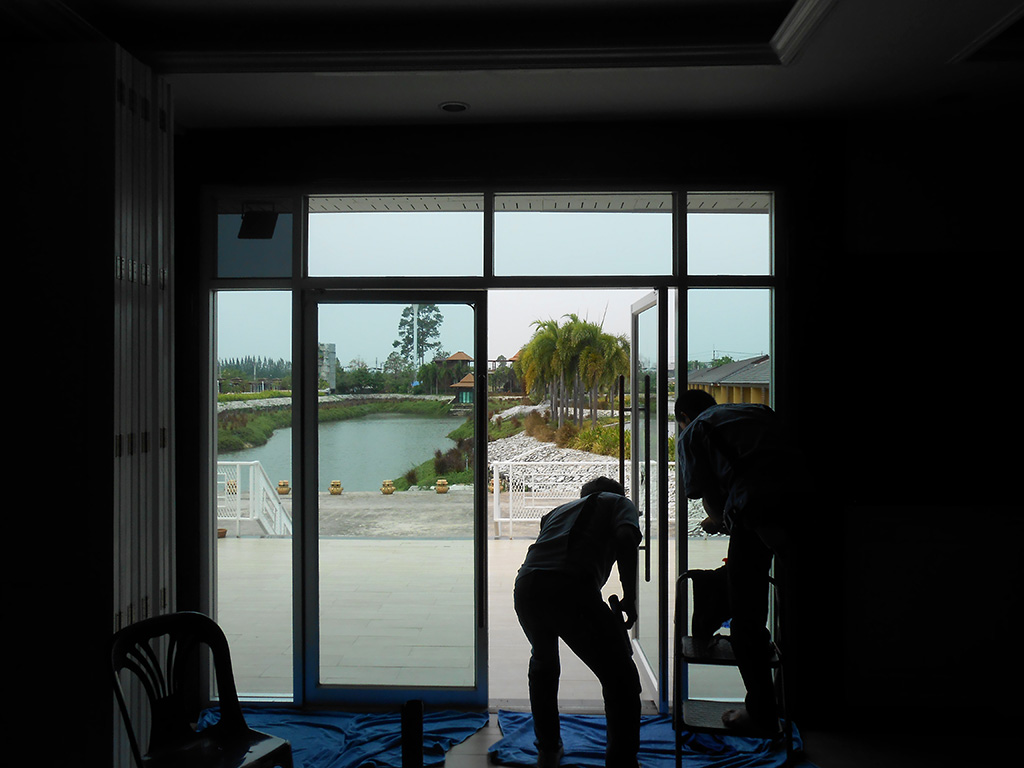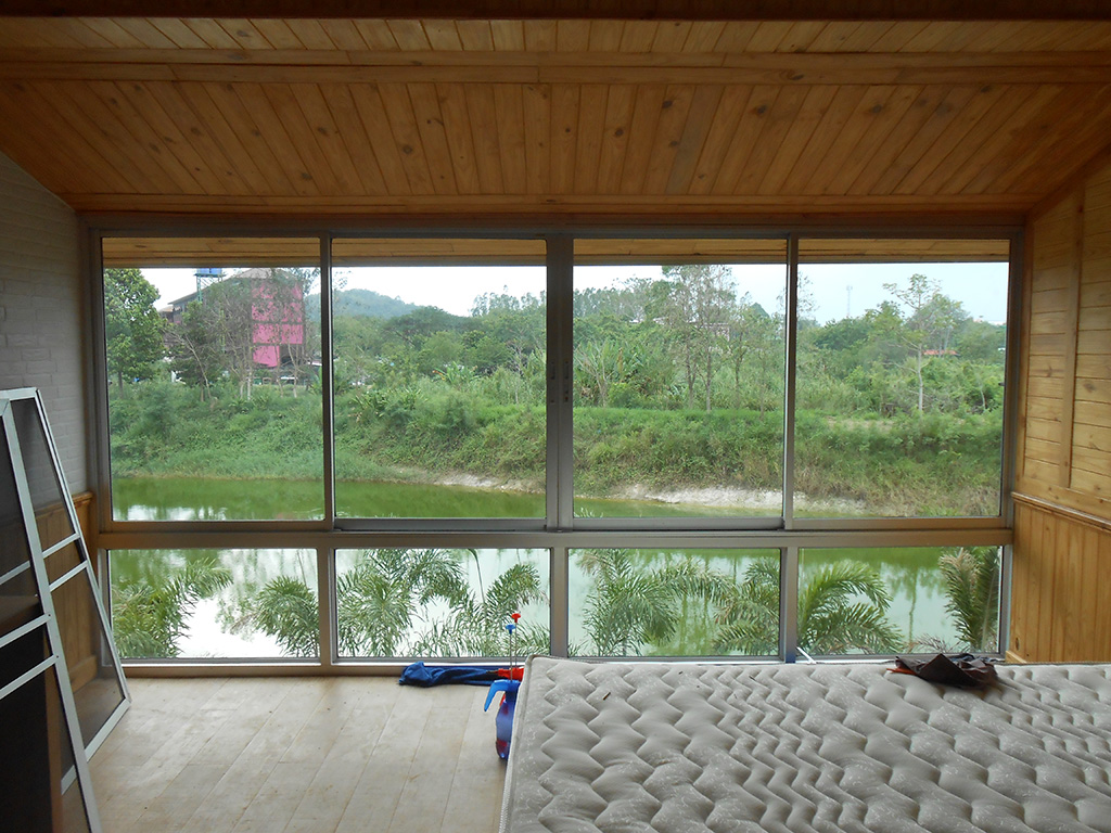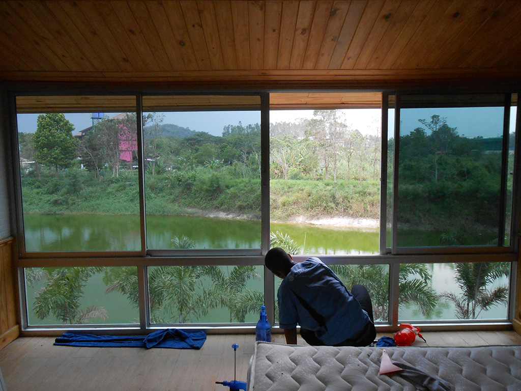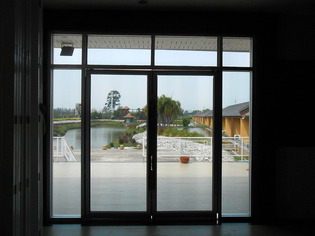 ที่ พริ้วลมชมน้ำ รีสอร์ท บ่อวิน ชลบุรี สร้างอาคารพักใหม่ มีกระจกบานใหญ่ภายในได้ติด Safety Film 4 Mil Clear เพื่อความปลอดภัยเมื่อกระจกแตก ฟิล์มนิรภัยจะยึดกระจกไม่ให้แตกกระจาย พร้อมกันนั้นยังได้ติดฟิล์มกรองแสงในส่วนที่รับแสงทางด้านหลัง ฟิล์มกรองแสงที่เลือกใช้เป็น MAXGUARD รุ่น STEEL35 ซึ่งมีคุณสมบัติการลดความร้อนได้ปานกลาง การมองออกเป็นธรรมชาติและไม่ทำให้ห้องพักมืดจนเกินไป และในส่วนของห้องประชุมได้ติดฟิล์มกรองแสง MAXGUARD รุ่น STEEL05 เพื่อลดแสงและลดความร้อน
